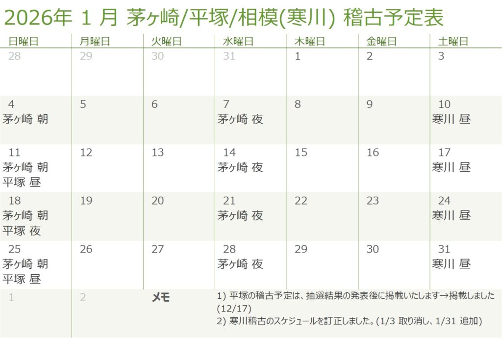 令和8年 1月稽古予定 投稿者:kougek 2025年11月19日2025年12月17日 寒川稽古のスケジュールを訂正しました (1/3 取り消し、1/31 追加) 平塚稽古のスケジュールを掲載しました(12/17更新)
